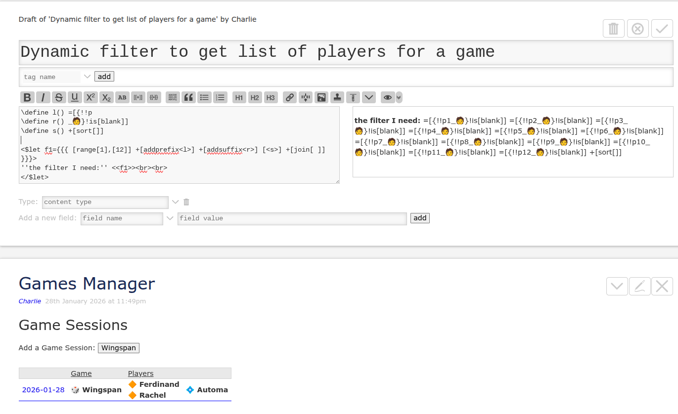 At the moment, the “Games Manager” tiddler gets a list of players with a filter that statically considers at most five players for a game.
