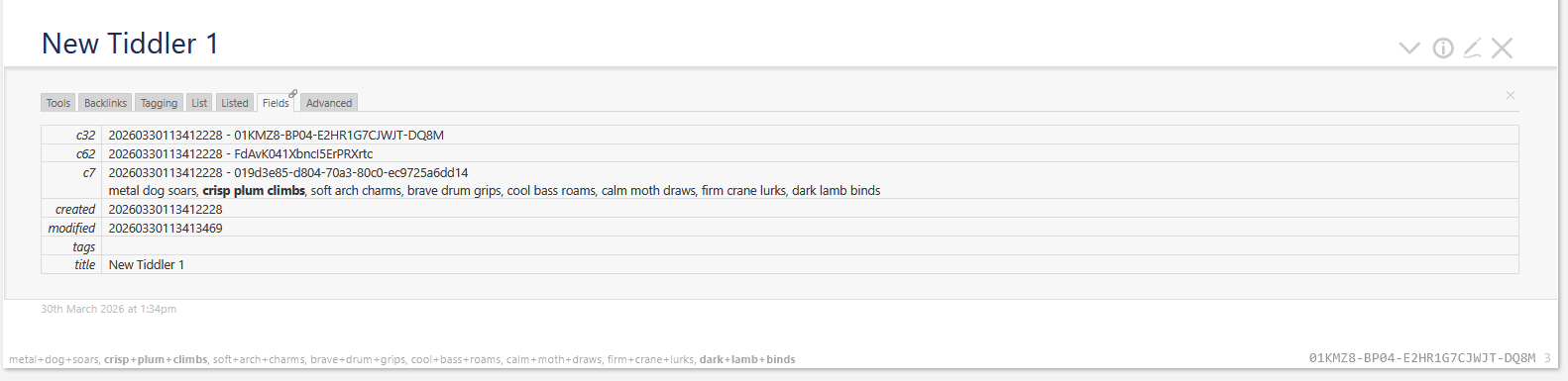 The plugin is available at wikilabs/uuid7 — install it, create a tiddler, and watch the c32 badge appear.
