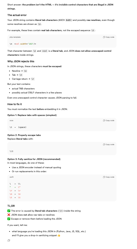 I finally asked CHATGPT what was wrong with the JSON and it replied as follows: