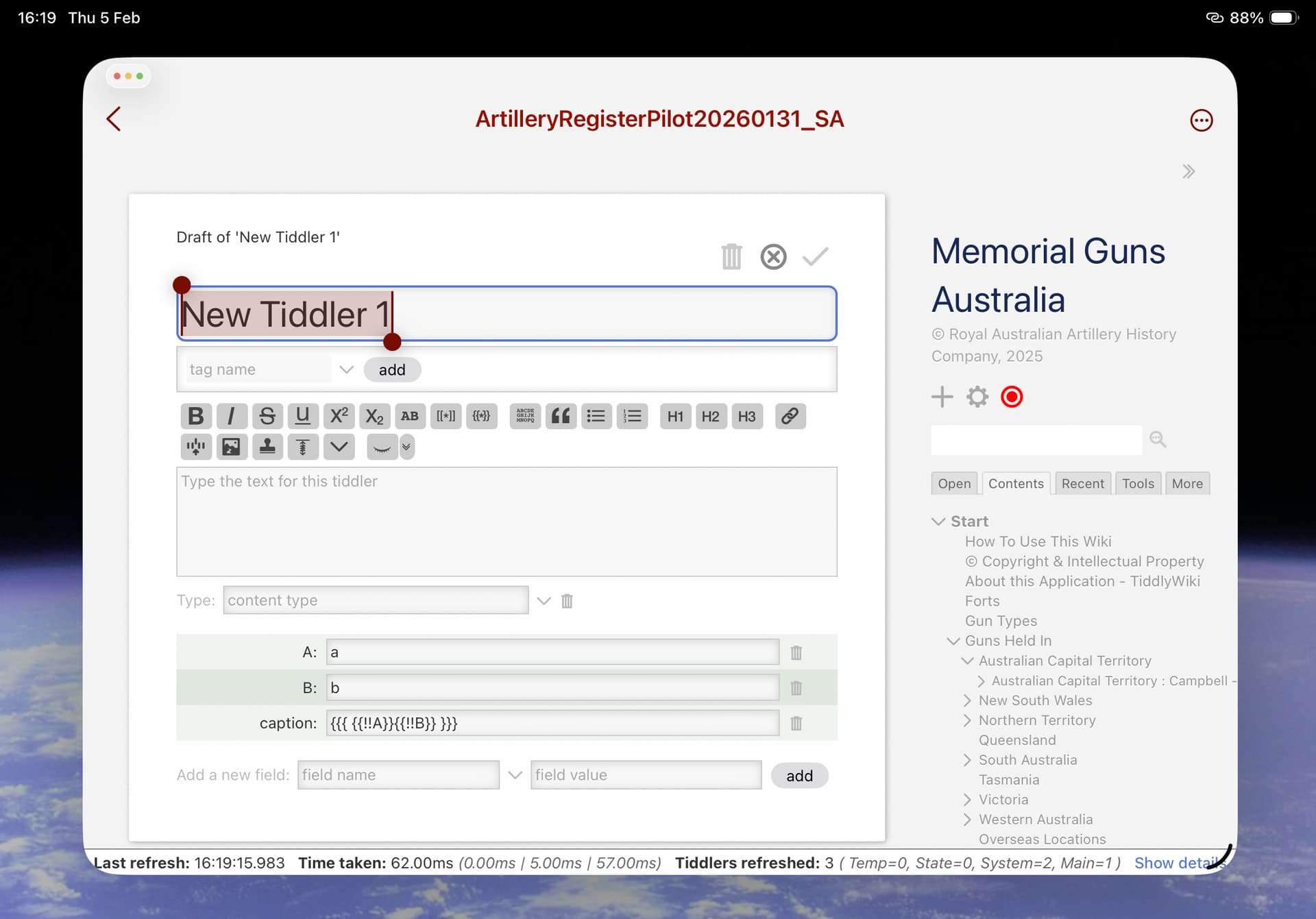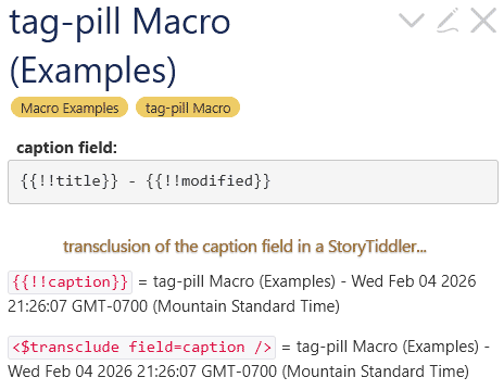 I am truing to have the caption of a gun entry be setup by the concatenation of three fields in the gun entry tiddler: state name, citytown and commonname.