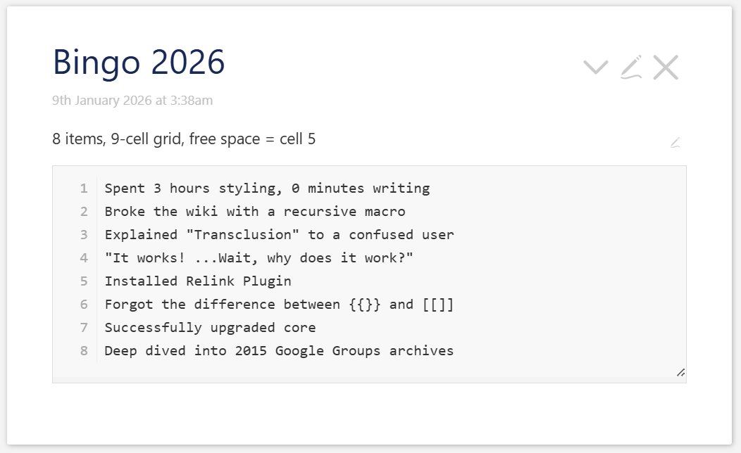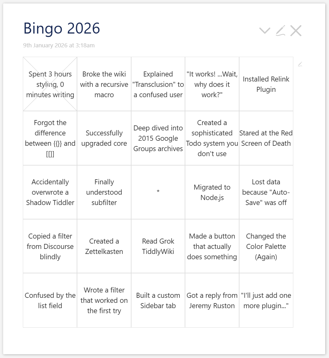 To add it to your wiki, copy-paste the wikitext bellow in a new tiddler, or drag-and-drop the “Bingo 2026” tiddler from the demo link above into your wiki.