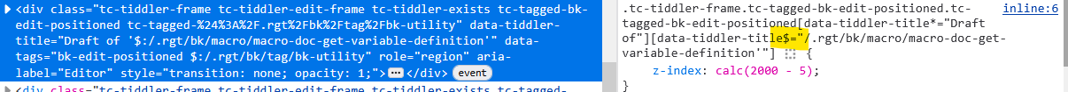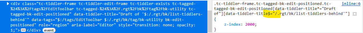 I’m glad this helped. Am I right that this is designed to do something interesting with Edit/Preview mode for tiddlers with a specific tag? If so, I’m intrigued by what you use this for, as it’s fairly rare for me to turn on preview mode. Or did I make unwarranted assumptions by inlining this in my tiddler?