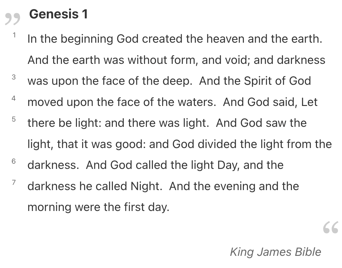 <<phrase-quote "Genesis 1" "In the beginning God created the heaven and the earth.And the earth was without form, and void; and darkness was upon the face of the deep.