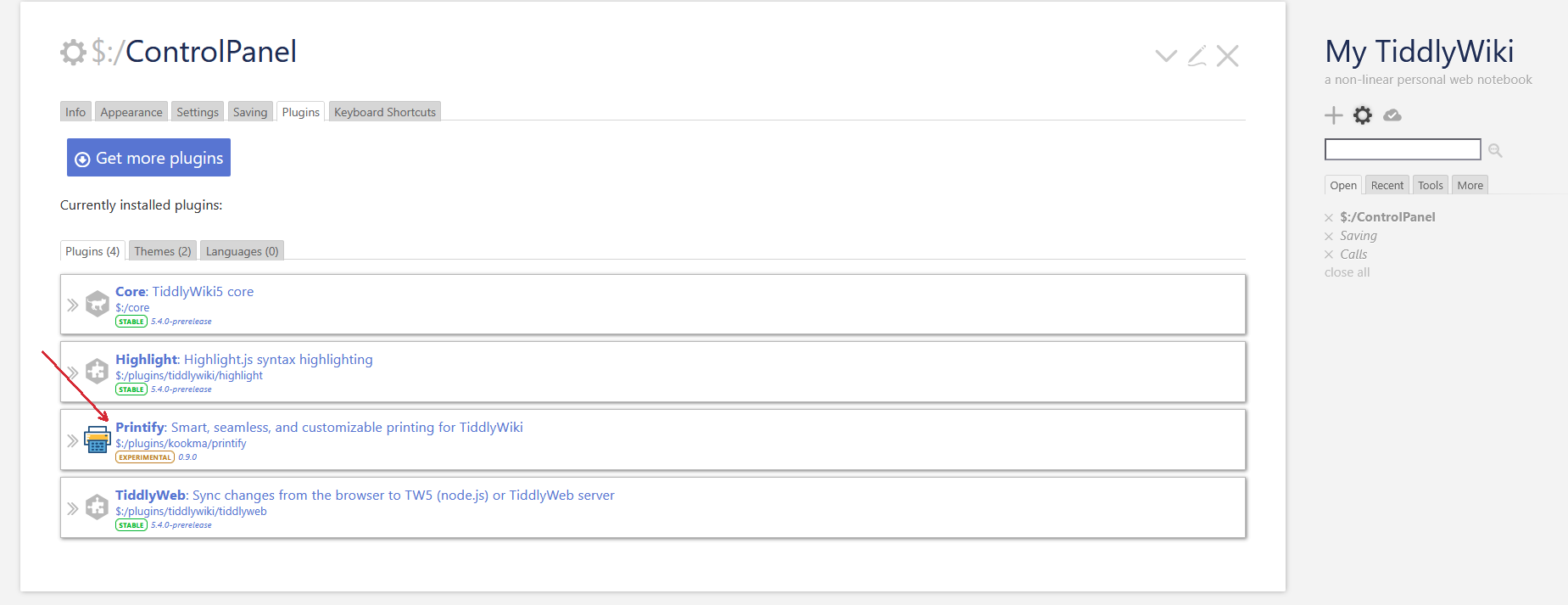 Much to my horror, after restarting the server, the content of my own wiki (a personal copy of Zettelkasten) had disappeared, and only the printify tiddler was showing. All the menus had disappeared, the structure of my wiki was gone and so on. Only the theme has persisted, somehow the plugin had managed to shadow everything else.