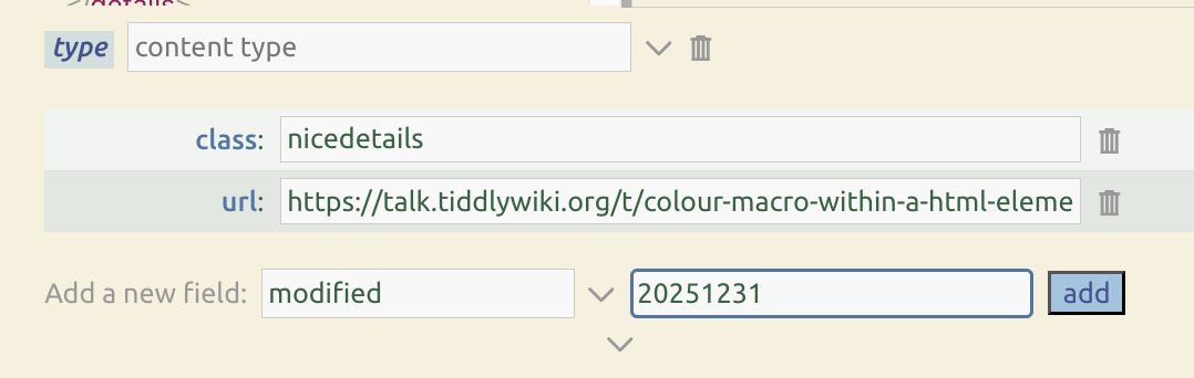 One other note: I often want to add/change not just the created field for old stuff, but also the modified field so the old stuff is not at the top of my recents sidebar. Modifying the modified field is tricky, because whenever you modify a tiddler — including by adding a value for modified field! — TiddlyWiki’s last step is to update the modified field to now. So, the workflow in this case requires turning timestamps off (usually in the “more” dropdown of page controls, where I have it near the top):