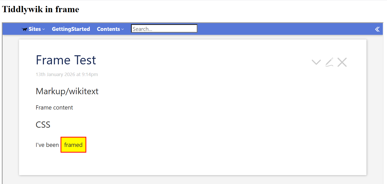 I want some elements in my wiki to be visible IFF the wiki is rendering within an iframe, but not when it’s being loaded directly (including, for example, a prominent invitation/link to open the site in its own tab or new window, plus hiding sidebar and other bulky elements, so the iframe can use limited space more efficiently).