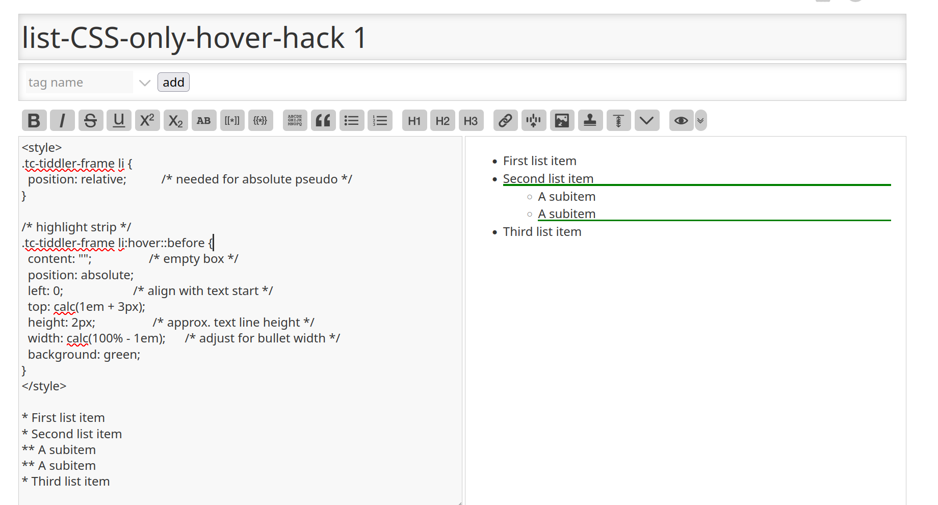 Hello all, I’m trying to add a hover effect on an unordered list (wikitext) such that the line you’re hovering over gets a yellow background. When nesting is involved, this fails due to how the HTML is generated, is there a CSS solution that will work?