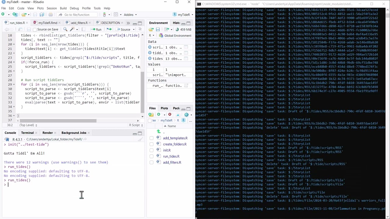 Imagine having one bag of tiddlers called scripts. These tiddlers contain scripts that run, for example, every hour. We may call them tides, representing waves of tiddlers being added by the external scripts. Some of us prefer R, so I started drafting the myTideR package as a proof-of-concept: