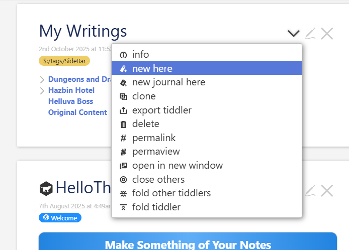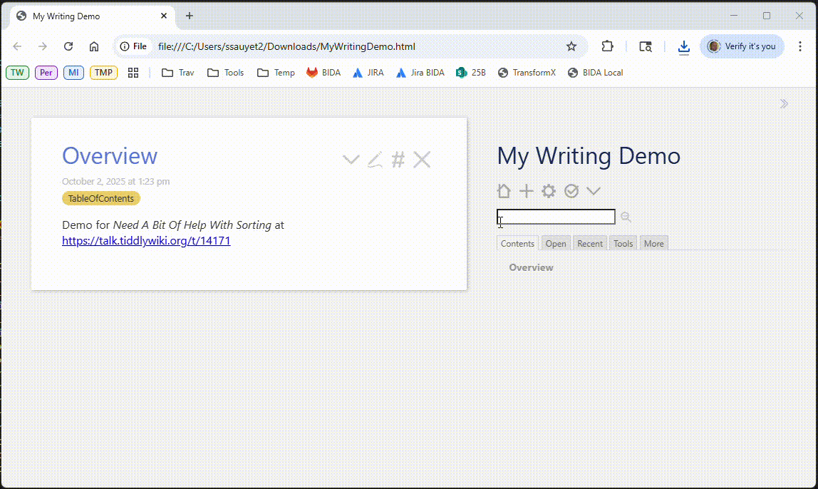Below is a picture of how my TiddlyWiki looks at the present moment.