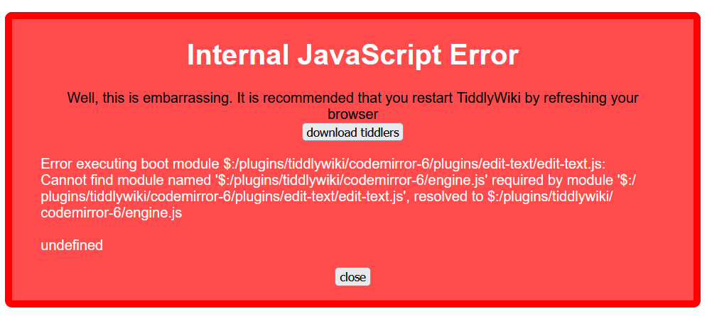 TW was not loading at all, all I got was the above. It’s too late to backtrack and find out the exact setting/option that might have triggered the above. I assume that having set CM6 as the default editor for every single input field (input, text area, title, tags etc), and then disabling CM6, TW Core was left looking for it but it could not.