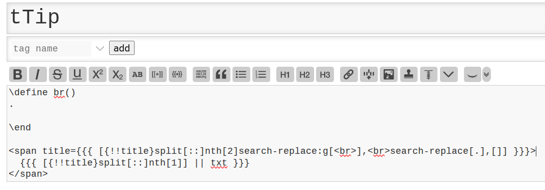 \define br() . \end <span title={{{ [{!!title}split[::]nth[2]search-replace:g[<br>],<br>search-replace[.],[]] }}}> {{{ [{!!title}split[::]nth[1]] || txt }}} </span>