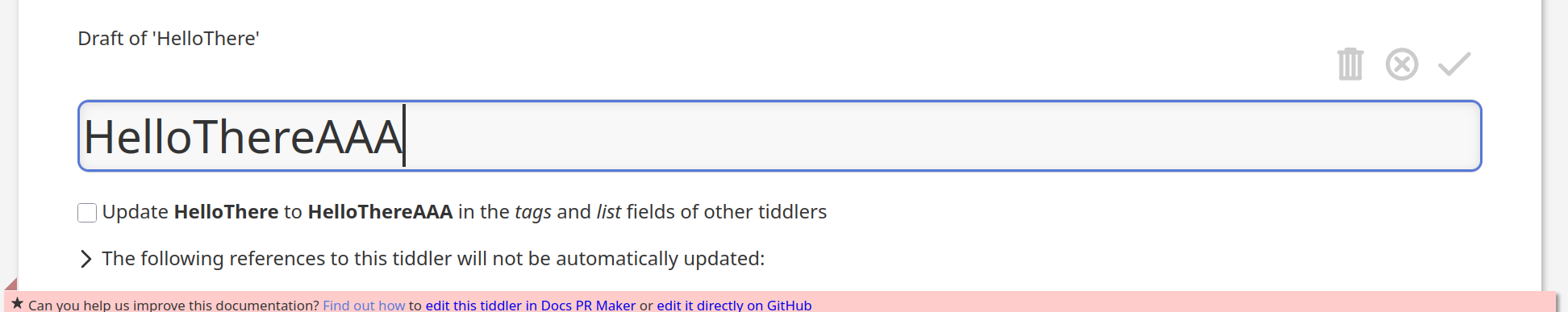 I thought I’d give it a try. I have no idea how to do this in wikitext, but I thought I might be able to at least contribute a JavaScript solution. And hooks sound perfect for this, as there is a th-renaming-tiddler hook that presumably matches. But clearly I misunderstand something, because the code in the handler is not called.