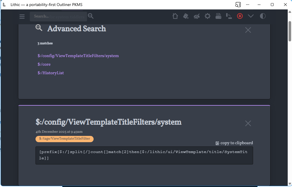 and you get $:/AdvancedSearch… I know these are system tiddlers but as part of the UI - i’d like to have better titles on these since they are used frequently … Likewise if I need a configuration component in a plugin - I’d also like a clean title but keep it hidden as a system tiddler