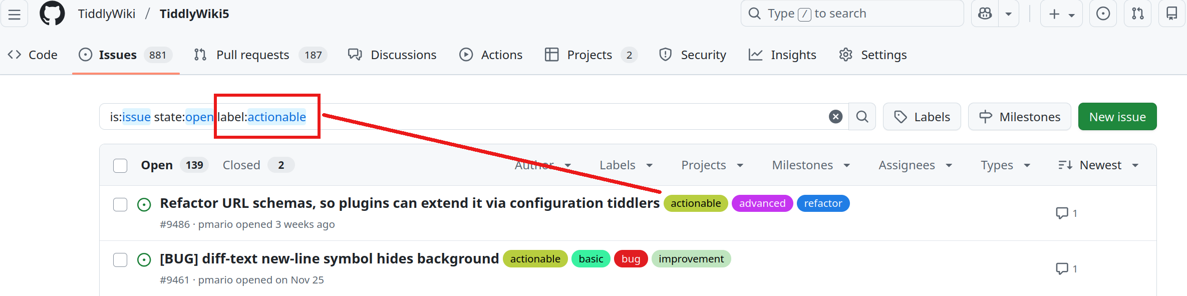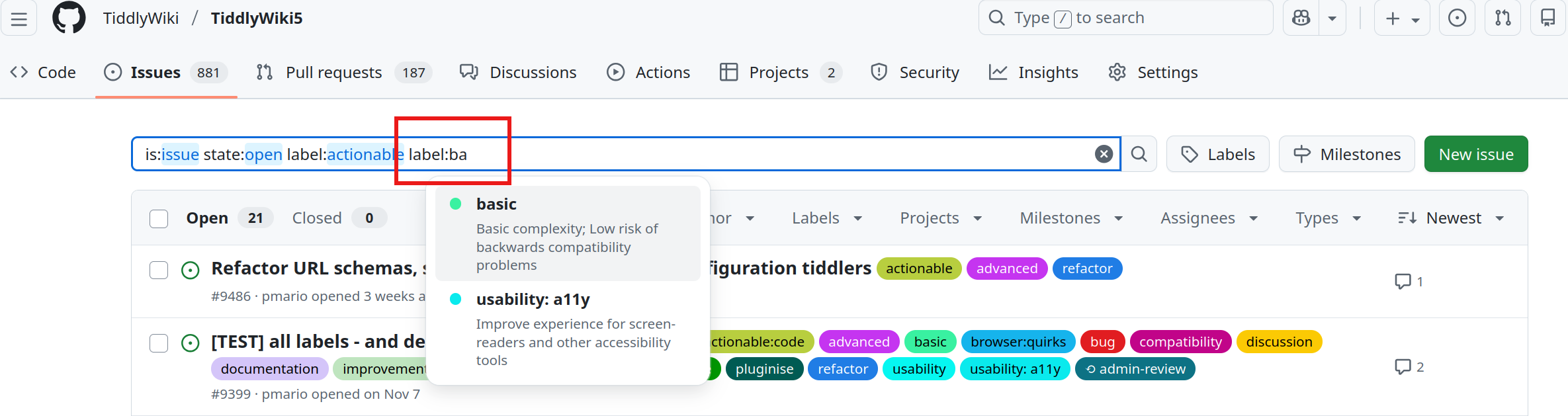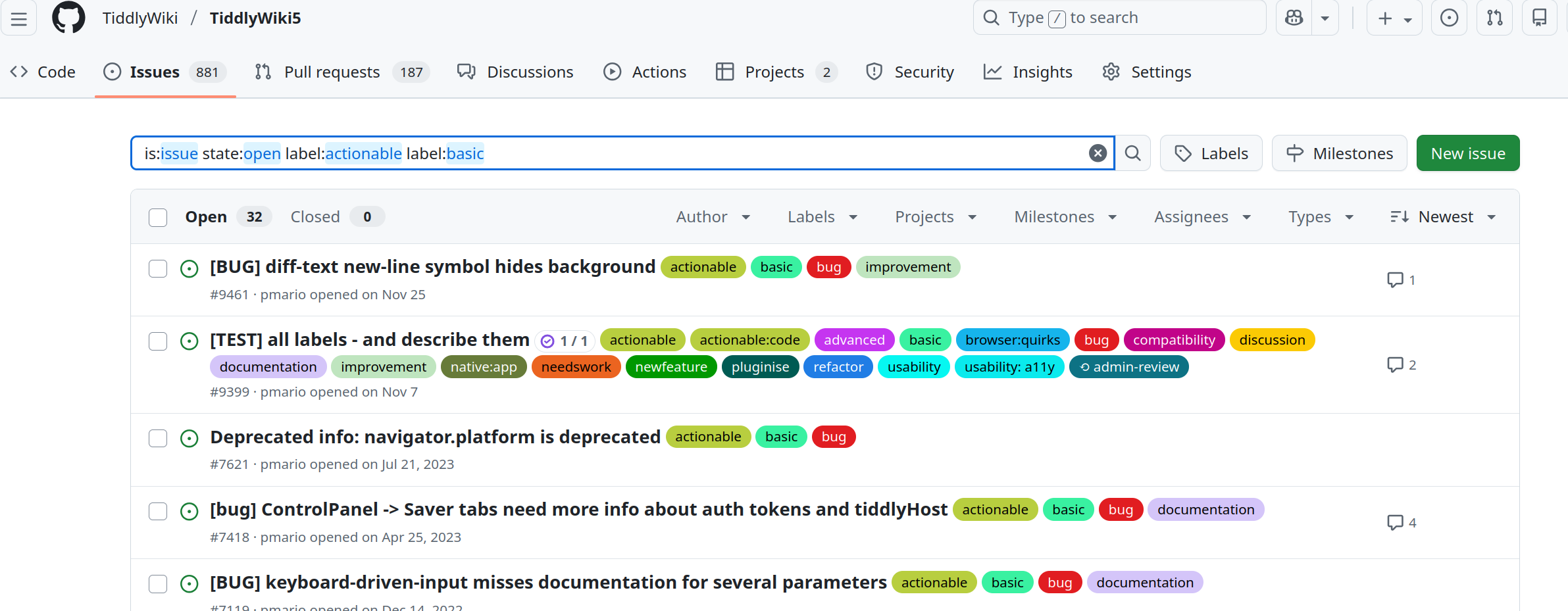 There is a GH issue: [TEST] all labels - and describe them · Issue #9399 · TiddlyWiki/TiddlyWiki5 · GitHub that has all labels assigned, so it will show up in every filter. It contains the same info that will follow here, as a reference. The text in the GH issue is the “source of truth”.