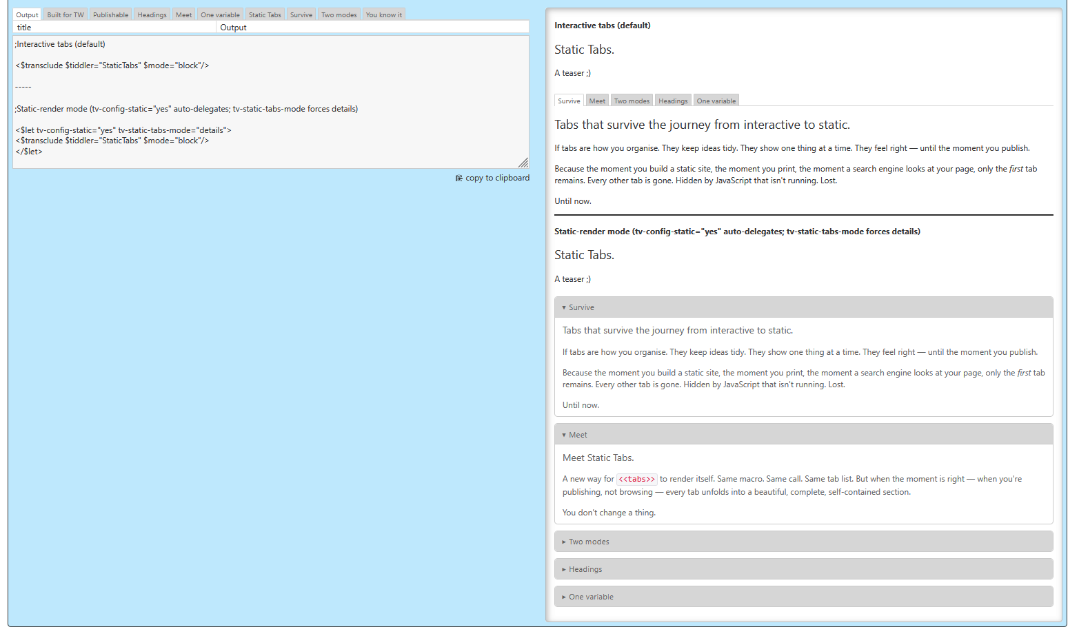 tv-config-static="yes" — already set during static-render. Do nothing, and your interactive tabs print themselves into beautiful static HTML. Add a single <$let> block, and you turn any page into a printable document.