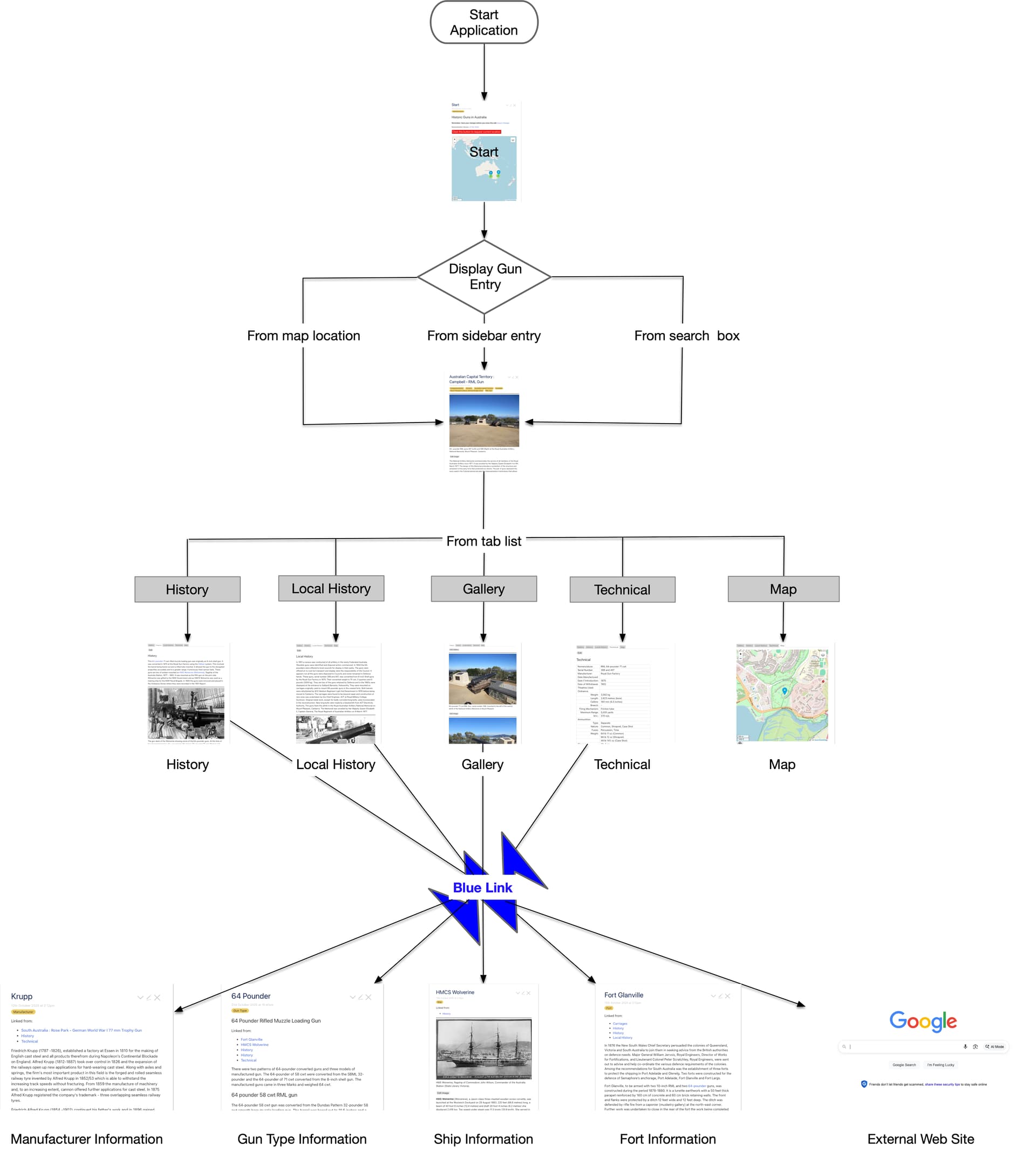For me the bottom half works a bit better than the top half. This is very much a “Flow Chart”, as it depicts how one might flow through your application, but the top bit hearkens too closely to software flow charts. The “Display gun entry” decision box feels wrong, because as a user I don’t think I enter the application and try to make a decision about which way I will choose to display an entry. I would suggest formatting this the same way you do “from tab list”, which instead of suggesting a conscious choice between alternatives simply shows the different paths you might take.
