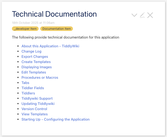 I am starting a developer documentation item in my tiddlywiki to provide some clues for future developers and support staff.