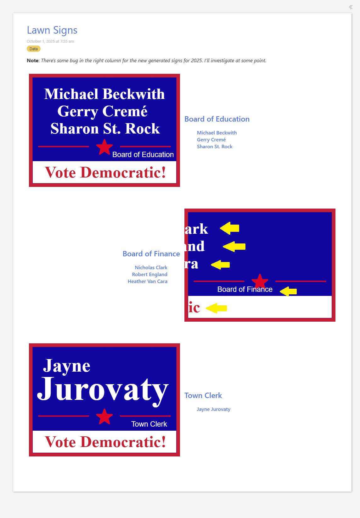 This year, I am not creating these images in an external tool and importing the PNGs to TiddlyWiki. Instead, I’m building them as SVGs inside TW, and planning on exporting the resulting file for the sign-maker. Everything seemed to go fine until I went to display them in a similar page to the above. This time all the text