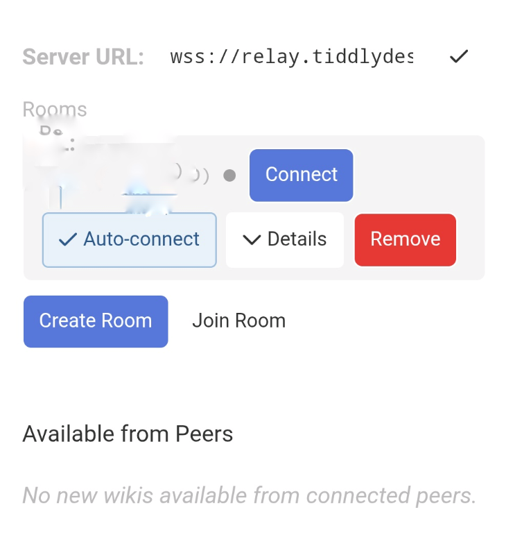Room and Sync buttons have appeared there. I choose my room name and the top right globe appears in the opened wiki telling me connected peers, I click on it and it gives phone name. The globe sits beside the hide sidebar chevrons - (they’re not related).