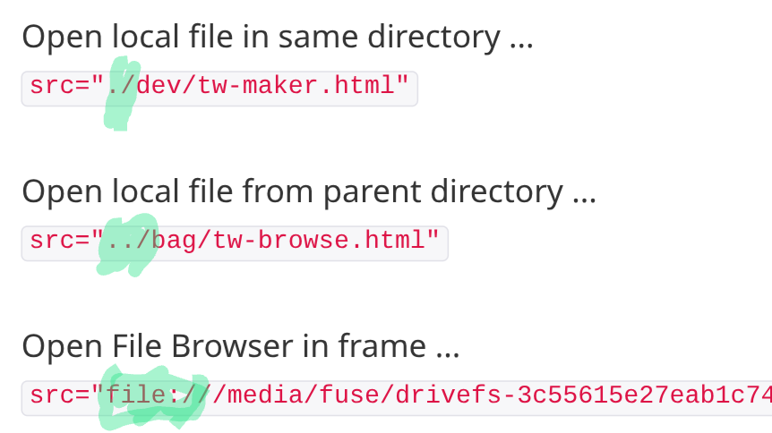 Background: In past I used iframes fine in TW to load Local files. Here is a snip of address starts I’d hoped to use in the miniBrowser …