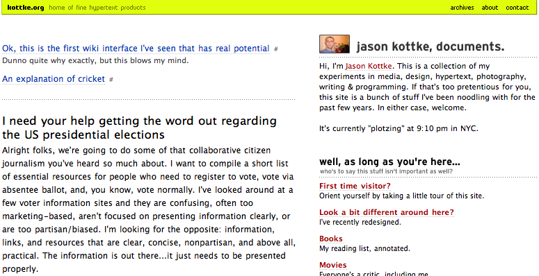 I’ve told the story before of how I posted a very crude first version of TiddlyWiki on 20th September 2004. I made a post on del.icio.us which at the time was the dominant link aggregator for Web 2.0, as it was called at the time. Two days later it was picked up by Jason Kottke, who wrote a popular blog around Web 2.0. His post triggered an avalanche of coverage. It was exhilarating and also overwhelming, in a good way.
