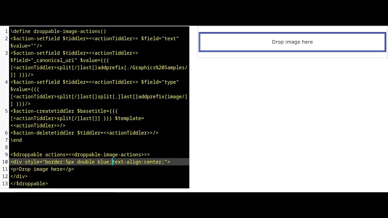 If I view a folder on my computer via my web browser, I can drag the links for image files from that directory listing in my web browser to that droppable zone I created and have displaying in my local TiddlyWiki.