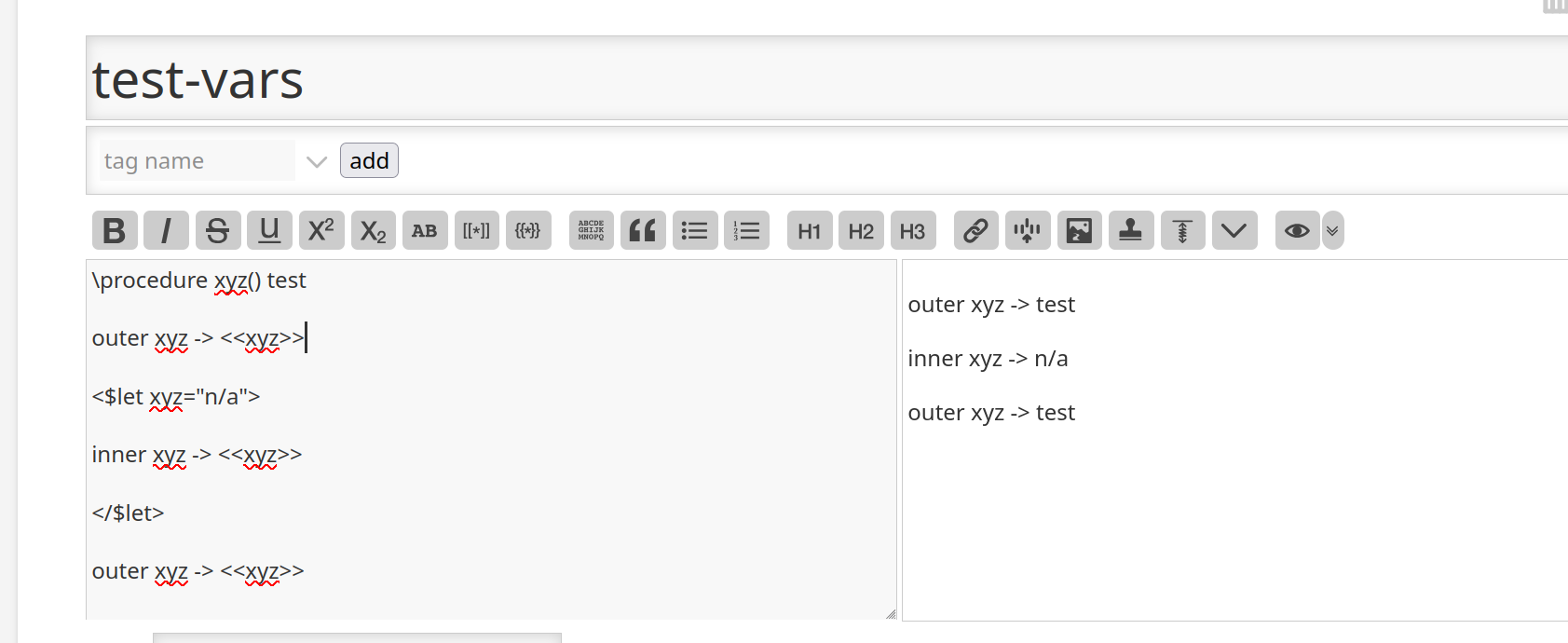 What do you mean by “unset”. Do you want to set the value to empty string like xyz="". Then yes. You can do exactly that. The core should handle this. I did use n/a as a placeholder for the “empty” string, so the differences of TW widget scope can be seen in the screenshot.