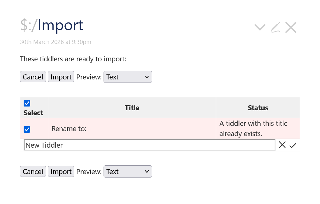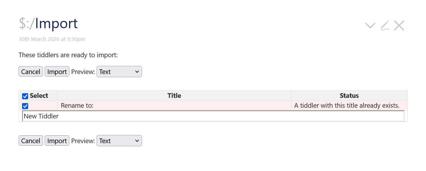 Tiddler1 – Lorem {{Tiddler1}} – Lorem error – error ⇒ text output only in preview
